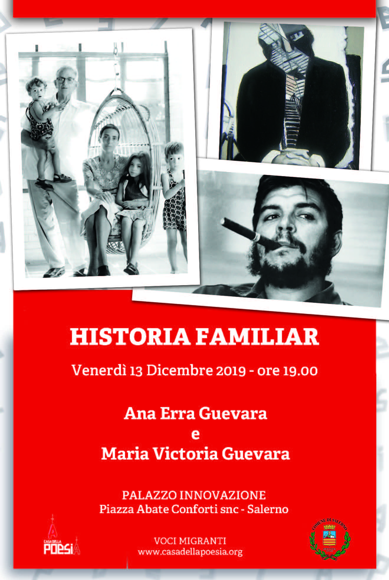 Venerdì 13 dicembre, alle ore 19,00, a Palazzo Innovazione, nell'ambito del progetto "voci Migranti" curato da Casa della poesia, in collaborazione con l'Assessorato alle Politiche Giovanili e all'Innovazione del Comune di Salerno, HISTORIA FAMILAR, incontro con la pittrice argentina, Ana Erra Guevara, vedova di Ernesto Guevara (il padre del Che) e sua figlia Maria Victoria Guevara, docente all'Università de L'Avana e sorella di Ernesto Che Guevara.